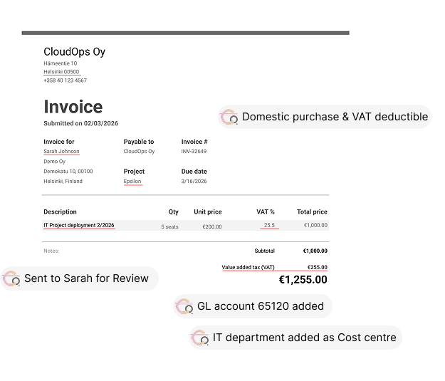 Suggests GL accounts, cost centers, VAT codes, and other posting dimensions based on historical accounting decisions and similar past invoices.